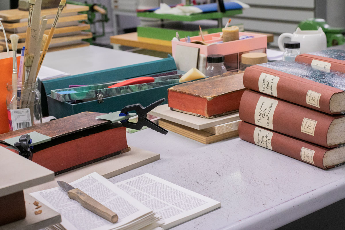 Geschichte: Restaurierungswerkstatt und Buchbinderei der Albertina Unibibliothek 2024.